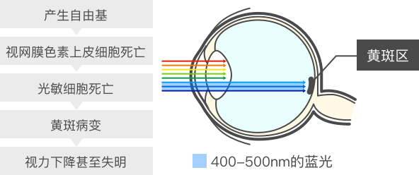 蓝光导致黄斑病:李查德·冯克(R.H.W. Funk)教授指出,手机、平板等屏幕光含有大量不规则频率的高能短波蓝光,它具有极高能量,能够穿透晶状体直达视网膜。蓝光照射视网膜会产生自由基,而这些自由基会导致视网膜色素上皮细胞衰亡,上皮细胞的衰亡会导致光敏细胞缺少养分从而引起视力损伤,此为老年失盲-黄斑病(AMD)的罪魁祸首。